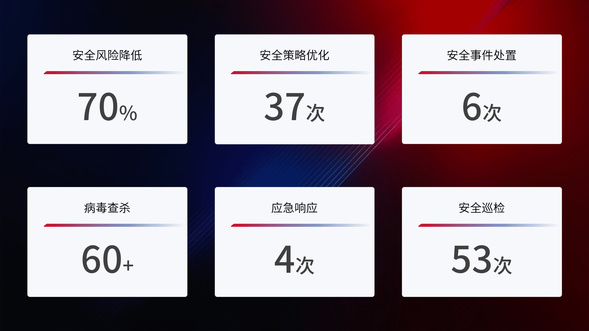 提供全面的安全事件报告体系,,,,包括处置报告、、、、周报、、季度和年度总结,,结合持续监控,,,,帮助客户深入了解网络安全状况。。