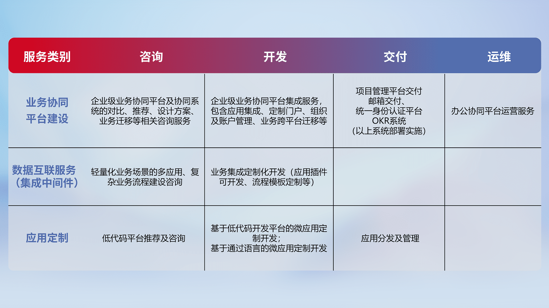 针对钉钉、、、企微、、、、IDaas等平台级产品提供产品的规划、、方案、、、、交付、、定制化开发等服务,,实现如统一协同办公、、、、智能客户服务、、混合会议管理、、智能数据查询、、、等业务场景,,实现数字化转型。。
